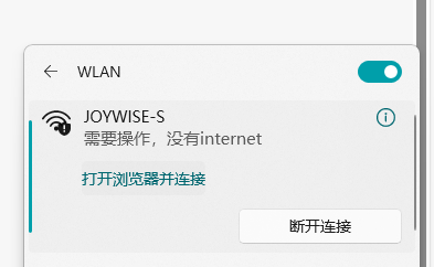 选择SSID为JOYWISE-S的无线网络,双击并连接,关联成功之后,会自动弹出登录认证界面,如未弹出请打开浏览器输入1.1.1.1 即可进入认证页面。