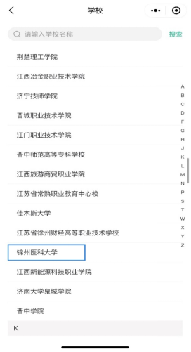 2、选择点击关注后选择绑定账号,在学校中搜索并选择<锦州医科大学>。